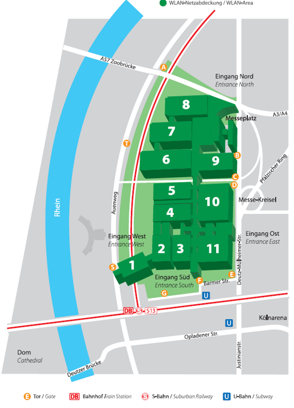 德国科隆国际展览中心在于Cologne对莱茵区道依茨,直接相邻科隆的道依茨展览站到南方。其中,该站连接德国联邦铁路公司到他 在 Hbf K和科隆/波恩机场。交易会的场地西边莱茵公园是一个40公顷的大公园,河上莱茵,和一个tanzbrunnen露天剧场。